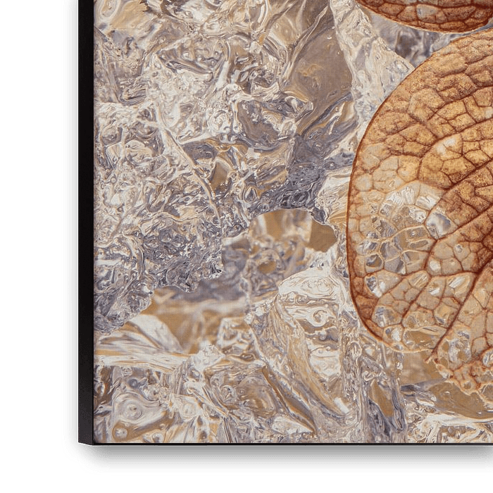 "Hydrangea leaf with blended texture" is a macro photo of a hydrangea leaf that has already partially decayed. As a result, the vein structure can be seen beautifully. This leaf lies on a bed of separate transparent material, which creates a distinct structure in the background of this work.