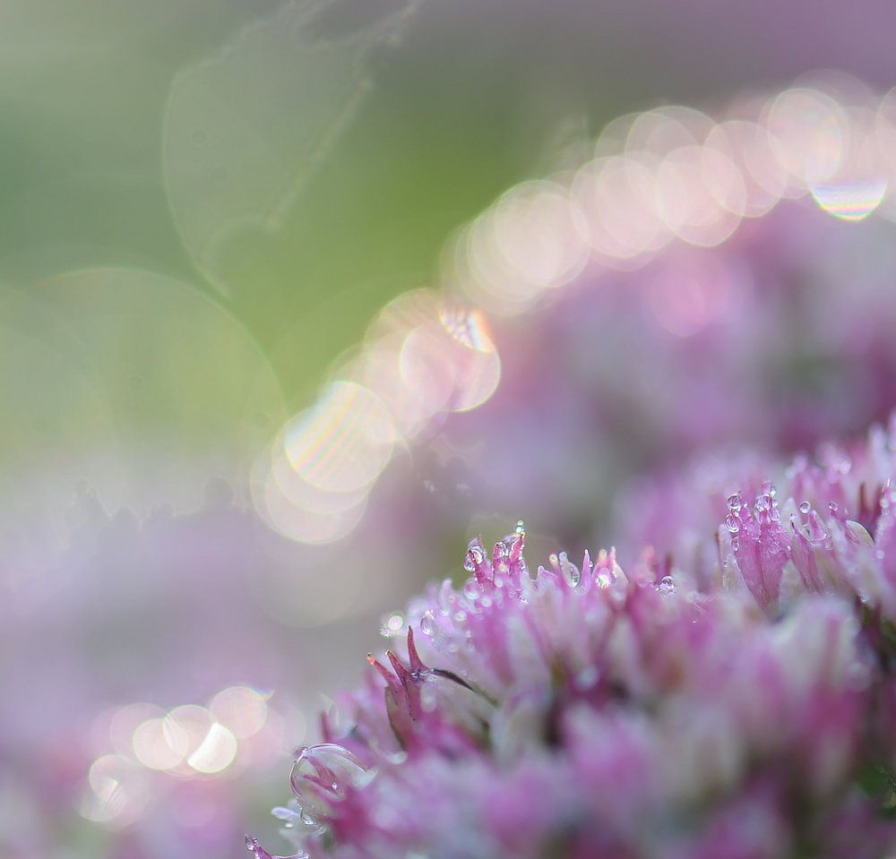 close up of Hylotelephium spectabile, or pink sky key, with little depth of field and the sheen of dewdrops in the background