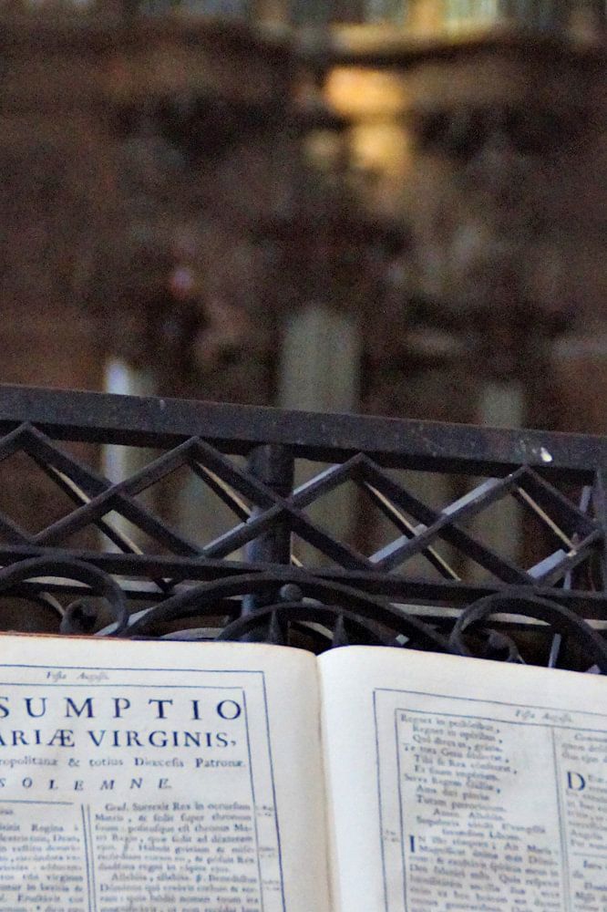Hymnbook with in the background the organ of the Saint Maclou church in Rouen, France, Normandy