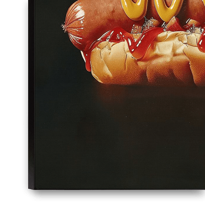 Is it a photograph? Or a painting after all? This stunning hyper-realist-style portrait captures a tempting hot dog in all its deliciousness, with a dramatic black background inspired by renowned artist Tjalf Sparnaay. The pop-art-like work brings the texture, colours and details of the burger to life in a stunning way.
