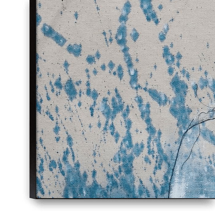 & A figurative abstract work of blue thread, charcoal, and acrylic on canvas.