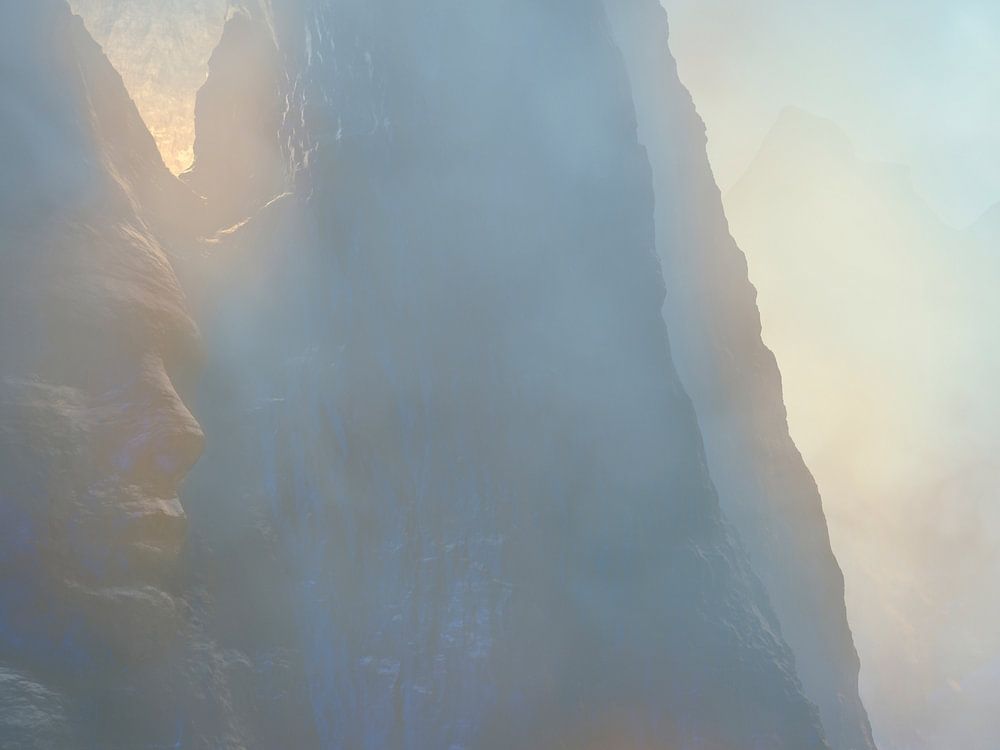 A red roofed church standing majestically in front of a towering mountain with the face of God watching over. The mountain is shrouded in fog, adding an ethereal quality to the landscape. The colors in the painting are primarily shades of gray and blue, with the church standing out as a focal point. I tried to capture the rugged beauty of the mountain, complete with steep cliffs and canyons. The overall atmosphere of the painting is one of tranquility and grandeur.
