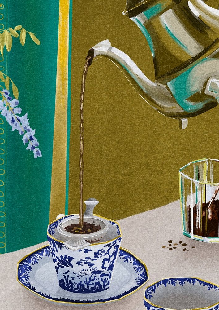 With a subtle hint to the hit series Bridgerton, this illustration is a beautiful combination of a still life and a film scene. A blend of Indian tea tradition and English crockery, exciting colours and romance in the wisteria.