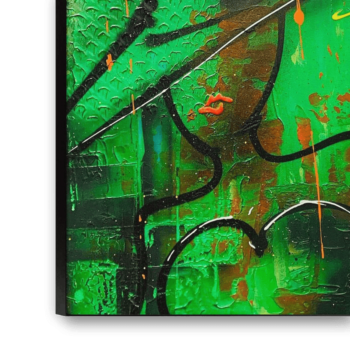 The painting has a dominant base colour, such as green, with brightly coloured accents shining through several layers of paint. The interplay of lines is clean and geometric, set up with moulds and stencils, creating a structured composition. In the foreground, a female figure is dynamically rendered with a spray can, stretching across the base. Subtle texts are both sprayed offhand and written in 3D on the canvas, creating a play of depth. Splatters and blobs are visible here and there, with thick paint adding texture and energy.