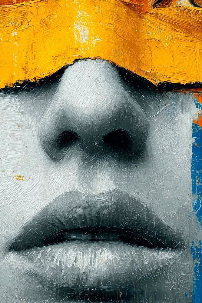 A striking portrait of a face, combining realism with abstract elements. Around the eyes powerful, textured brushstrokes resembling a band across the forehead contrast with the monochrome skin tones. The overall style conveys a sense of modern artistry where realism and abstraction come together seamlessly.