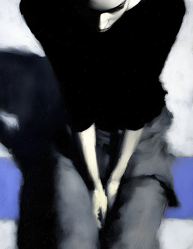 Step into a world of introspection and quiet power with this evocative artwork. The work depicts a solitary figure, rendered in a striking palette of monochrome hues, and punctuated by a striking horizontal blue band - a visual anchor that draws attention and invites contemplation. The artist's masterful use of light and shadow creates a dramatic contrast, highlighting the delicate posture of the subject and the emotional charge of the moment.