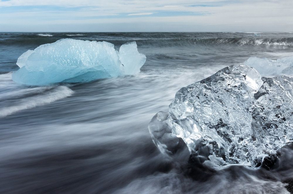 This photo shows two imposing ice blocks on Diamond Beach, an iconic location in Iceland. The slow shutter speed beautifully captures the movement of the water, creating a dreamy and almost ethereal effect. The ice blocks, shimmering under the sun's light, form an enchanting contrast to the calm, slow-motion water washing against them. A celebration of Iceland's natural splendour, this photo is perfect for lovers of landscape photography, natural beauty, ice formations, slow shutter speed techniques, and travel photography.
