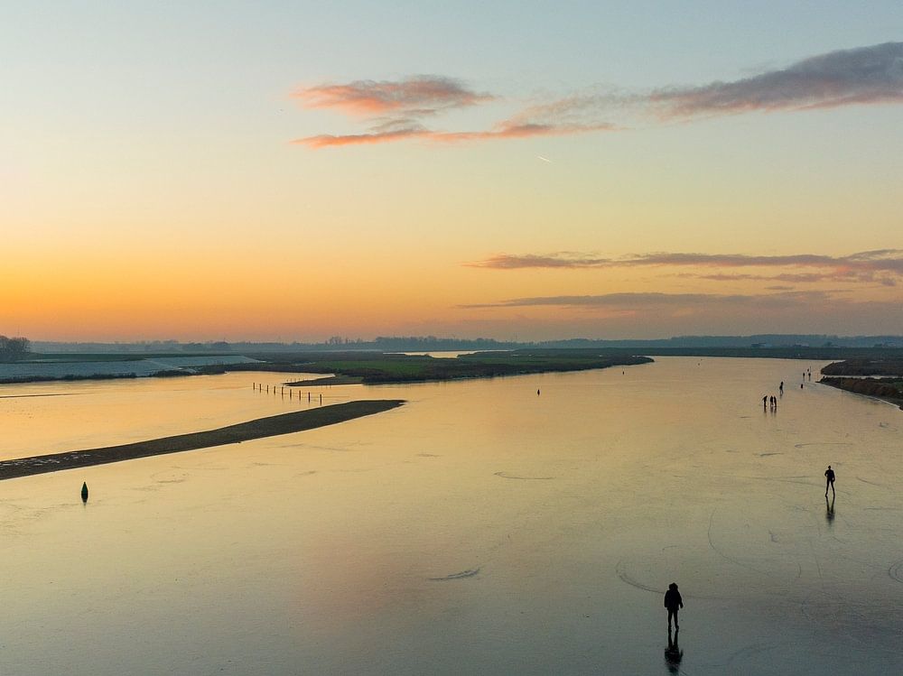 People ice skating on the Reeve waterway in the Reevediep bypass lake near Kampen during a cold winter day in The Netherlands. Ice skating on natural ice is an old tradition in The Netherlands and a popular leisure activity whenever it's cold enough for lakes and rivers to freeze over.