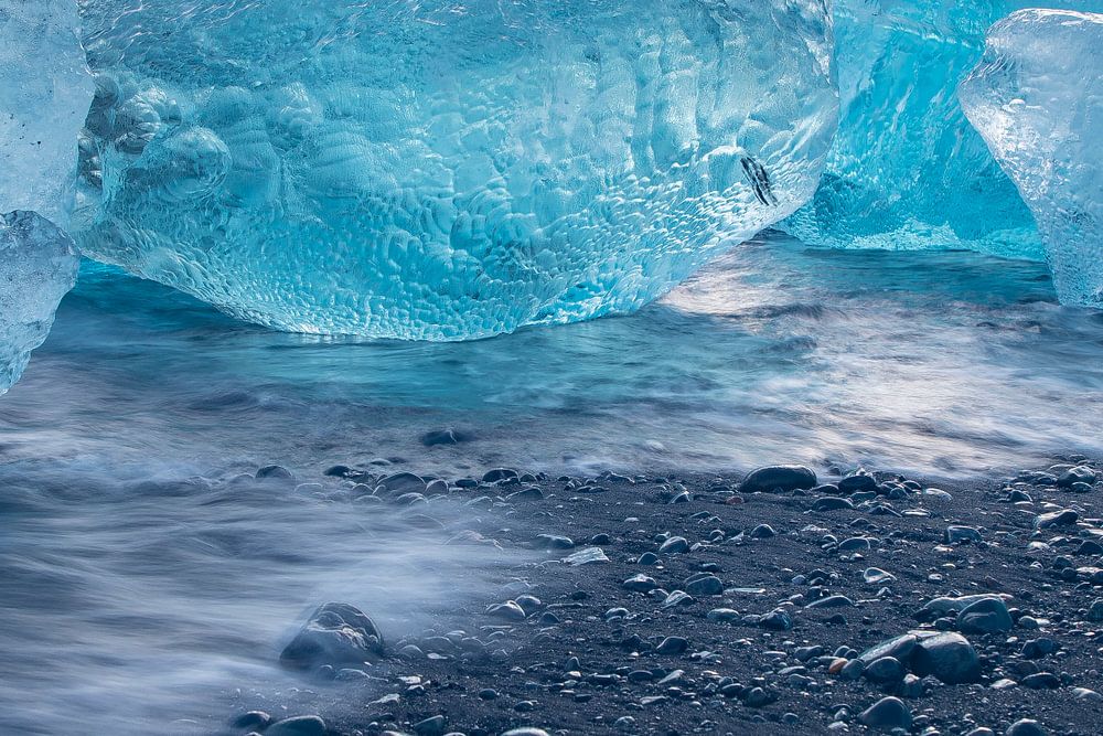 Iceland, Diamond Beach, icebergs on the beach near Jokulsarlon in southern Iceland. These pieces of ice broke off from the Vatnajökull glacier and then washed up on the black beach.