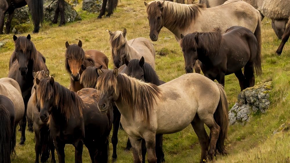 This photo captures not only the strength and serenity of these special horses, but also the typical Icelandic landscape: rolling hills, lava rocks and an open horizon that seems infinite. The natural colours of the horses - from deep brown to light grey - subtly blend with the green and yellow of the summer grass, creating an image that radiates calm and strength.