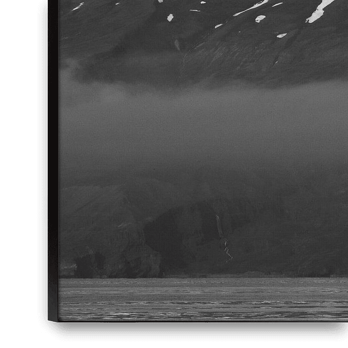 Sailing on a boat I took this picture of the fog and the mountain tops above it, which are snowed in during the summer months. The calm sea makes for a nice picture to look at.