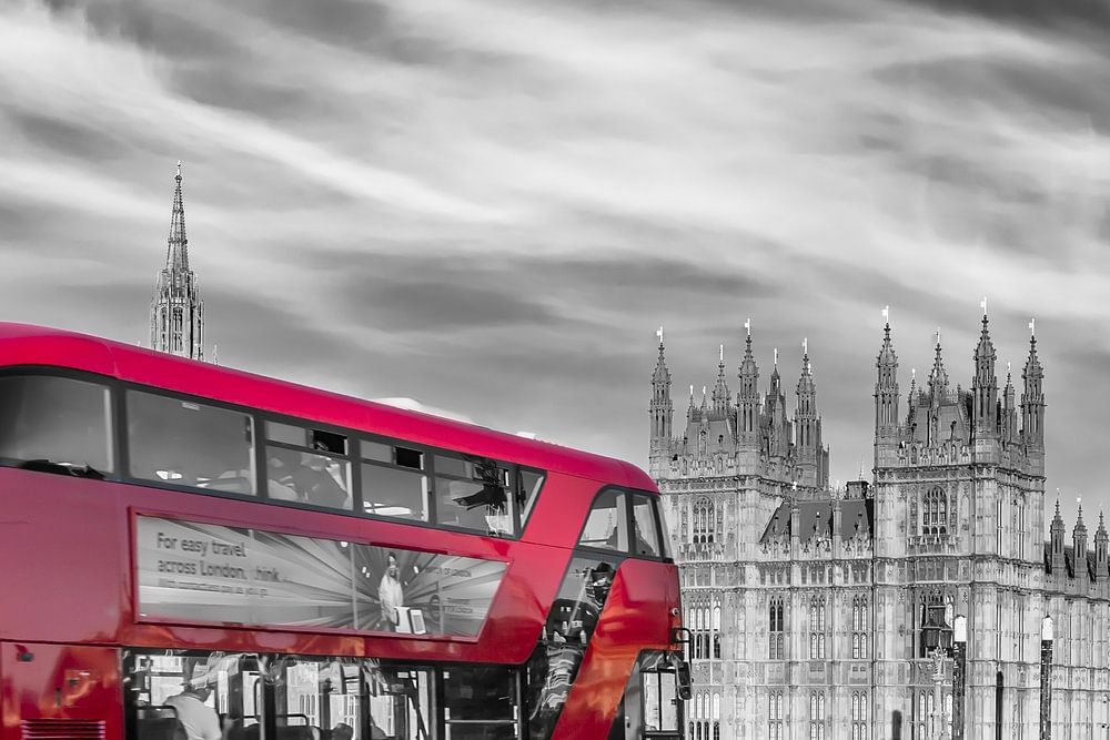 Two bright red London double-decker buses travel across Westminster Bridge and become the dominant focal point of this striking London city scene. Through the selective use of color, the iconic buses stand out powerfully against the surrounding architecture and sky, which are rendered in elegant black and white. In the background rises…