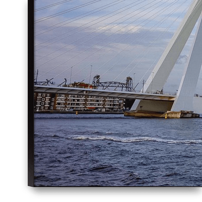 Wide panorama with Kop van Zuid skyscrapers next to Erasmus bridge and water taxi racing by on the Maas, raising waves in the river behind.