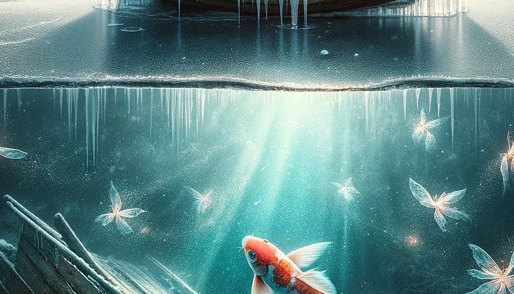 Under the starry sky, this picture brings an ice-covered scene to life. A frozen boat hangs on the surface of the water, while the world below is bathed in a muted, mysterious blue. An orange koi cuts through the still water, surrounded by gently floating, luminous insects that lend the icy depths a fairytale-like flair. The calm tranquillity is only interrupted by the gentle glitter, which looks like sparkling snow beneath the waves. This painting is a poetic expression of the stillness and peace that can be found in winter nature, a silent witness to time that seems to stand still beneath the icy blanket.