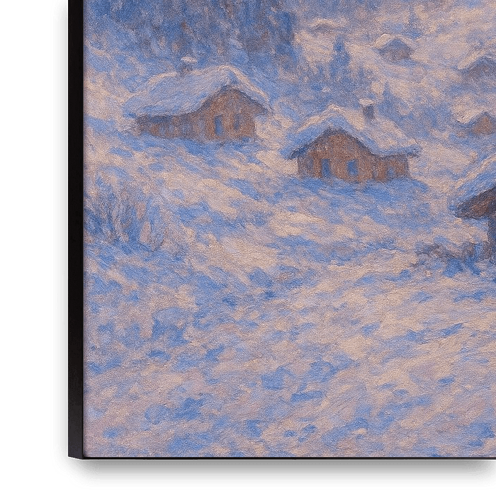 Snow blankets a mountain valley beneath a sunrise painted in rose and violet hues. The day awakens slowly, each ridge and treetop dissolving into the gentle mist of morning. Inspired by the luminous palettes of Claude Monet, this artwork turns a simple alpine landscape into an emotional symphony of light and peace. The brushwork glows…
