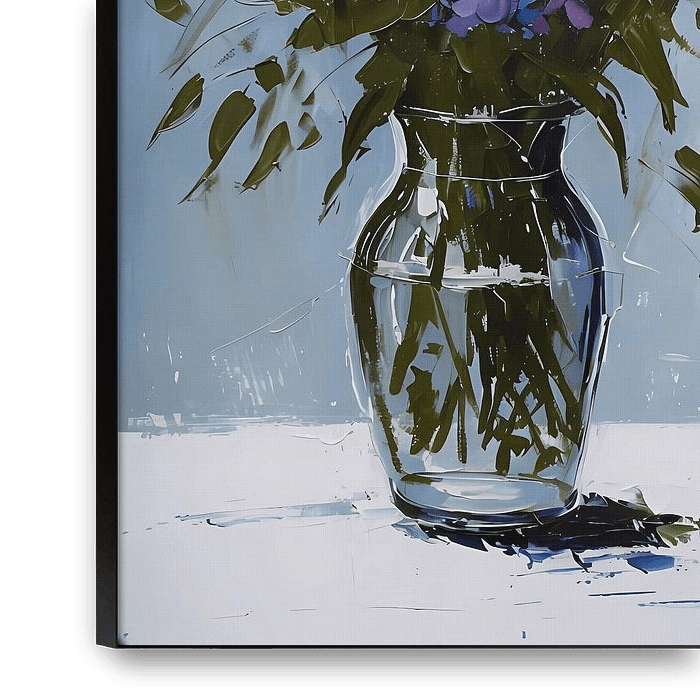 This is a vibrant and impressionistic still-life painting of a bouquet of flowers in a glass vase. The flowers are depicted with thick, visible brushstrokes, creating a textured and lively effect. The color palette is dominated by shades of blue, pink, and purple, lending a soft and romantic feel to the artwork. The flowers are arranged…