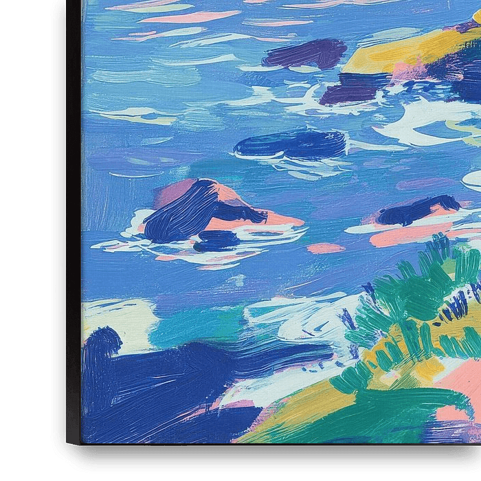 This vibrant painting features a blue and yellow lighthouse on a small peninsula as its central focal point. The scene is rendered in an expressive, impressionistic style with clearly visible brushstrokes. The sky transitions from warm pink on the horizon to cool blue, interspersed with yellow and green highlights that hint at the…