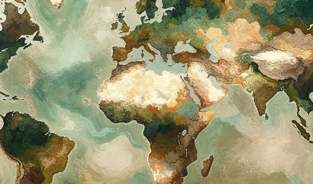 Impressionistic world map mer Wabi Sabi colours by Maps Are Art