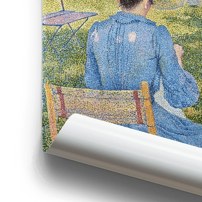 Van Rysselberghe began this painting in the summer of 1889. The woman in the blue dress in Maria Monnom, with whom he would marry in the autumn. That summer, the Monnom family stayed in Thuin, in southern Belgium. The garden shown here is probably the orchard of the nearby Abbey of Aulne.