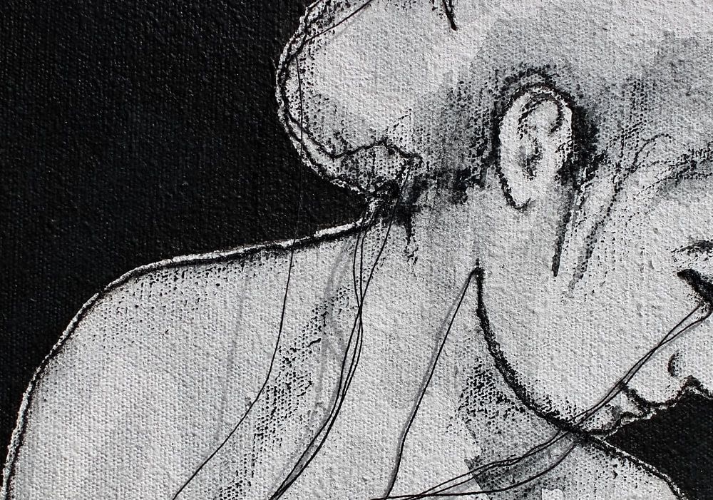 A figurative painting of a woman in black and white. Black threads are applied and give the image emotion and movement. Like all of Kim's works, the atmosphere is powerful & vulnerable.