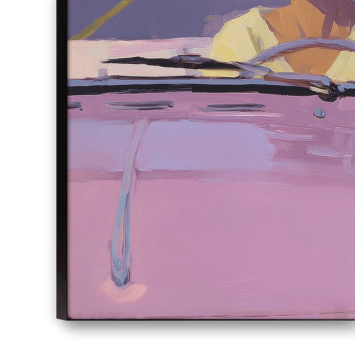 This impressionist painting shows a woman with a high ponytail, adorned with a light pink headscarf and white sunglasses. She wears a yellow top and sits relaxed in a pink convertible with the top down. The windscreen reflects the sky and palm trees, while the interior is in soft shades of pink and blue. The background shows a bright sky scene with palm trees, conveying a summery lightness. With visible brushstrokes and a focus on colour and form, the image emphasises the contrast between hair, clothing, car and sky, creating a modern, vibrant composition.