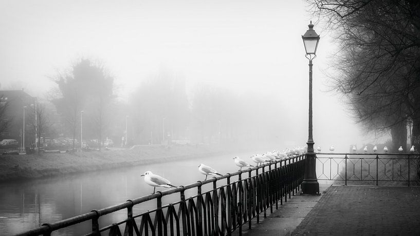 A couple of seagulls in a row on a banister of the Muntsluis in Utrecht. Nothing to do but sit down. It was quite foggy, and I wanted to emphasize the chill of this morning fog.