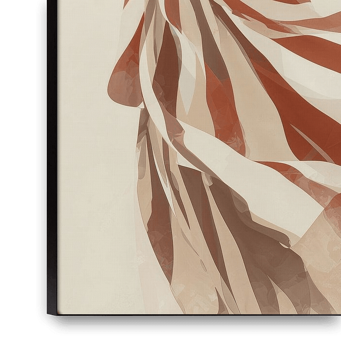 Een minimalistisch kunstwerk in warme terracotta tinten toont een sierlijke silhouet, gehuld in een wapperende jurk of gewaad. De beweging van de stof is op een abstracte wijze vastgelegd, waarbij de lijnen en vlakken een dynamisch spel vormen tussen licht en schaduw. De compositie straalt zowel kracht als elegantie uit, met een…
