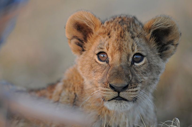 Het geluid van de sluiter van de camera trekt vaak de aandacht van wilde dieren. Deze welp kijkt dan ook heel verbaasd naar de camera. In de ogen is de auto goed te zien en ook de boom waar we onder staan.