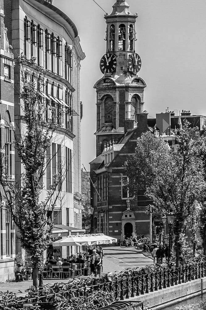 The Munttoren (Mint Tower) is a tower in Amsterdam, the Netherlands, which was originally part of the Regulierspoort, one of the main gates in Amsterdam's medieval city wall. It stands next to Amstel river and the famous flower market. Monochrome impression from the historic city center. Fantastic cityscape from a series of additional urban impressions.
