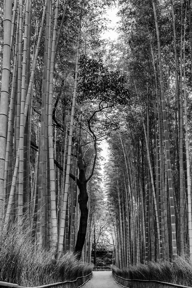 The Arashiyama Bamboo Forest is one of the most impressive sights in Kyoto. Walking through the bamboo forest feels like entering another world. The tall bamboo trunks reach high into the sky and form an impenetrable canopy of green leaves over a narrow path. The contrast of light and shadow created by the dense bamboo trunks lends the surroundings a mysterious and fascinating atmosphere. The Arashiyama bamboo forest is not only a visual spectacle, but also a place of peace and meditation. The gentle rustling of the bamboo leaves in the wind creates a calming soundscape that invites visitors to leave the hustle and bustle of everyday life behind and immerse themselves in the natural beauty of their surroundings. A classic black and white image.