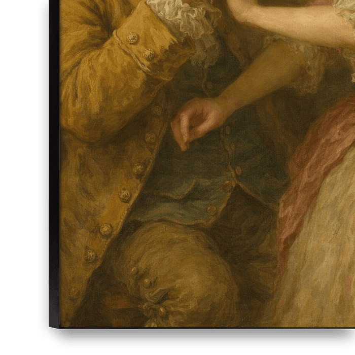 In this painting, a playful moment is frozen in time: an elegant woman in 18th-century dress blows a huge, shiny pink gum bubble, as she gently pushes off the man next to her with a mischievous look. He leans curiously towards the bubble with a small needle, ready to disrupt the moment, but both seem to be laughing more at their game…