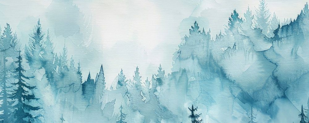 This watercolour artwork depicts a dreamy and mystical forest landscape shrouded in various shades of blue and grey.