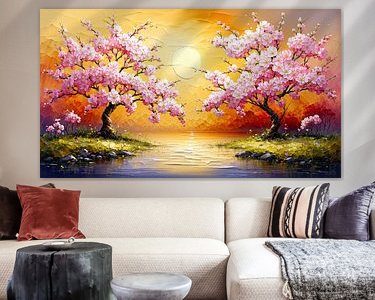 This impressive work of art transports the viewer to a peaceful, almost magical scene. Two magnificent Japanese cherry trees in full bloom are enthroned on small, enchanted islands that rise like delicate oases from the smooth, reflective surface of a calm lake. The two trees stand to the left and right of the picture and unfurl their lush corollas, whose delicate petals glow in warm, spicy colours.