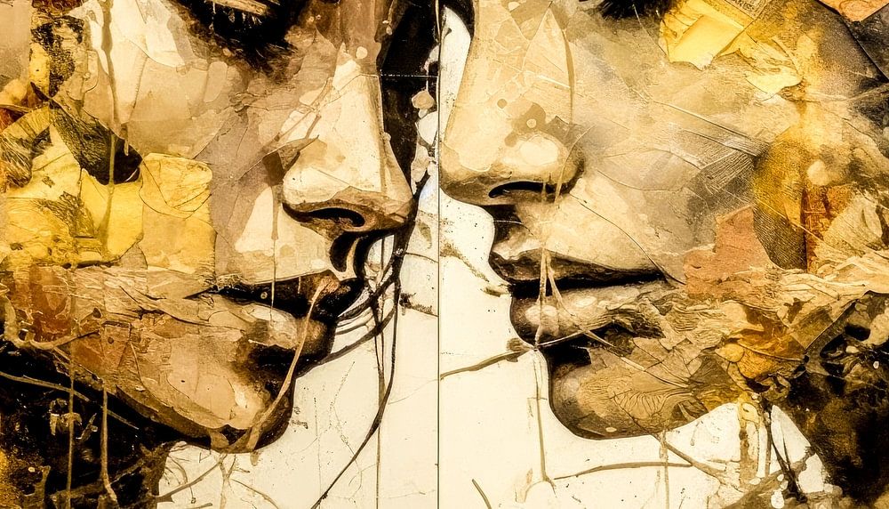 This painting shows an intimate and powerful encounter between two faces that are almost touching, as if they are immersed in a silent, intense dialogue. The two women appear to be in a state of deep reflection, their closed eyes hinting at an inner connection that goes beyond words. The warm, earthy colour tones, interspersed with light gold accents, create an atmosphere of warmth and naturalness, while the abstract, sometimes torn textures reinforce the emotional complexity of this scene.