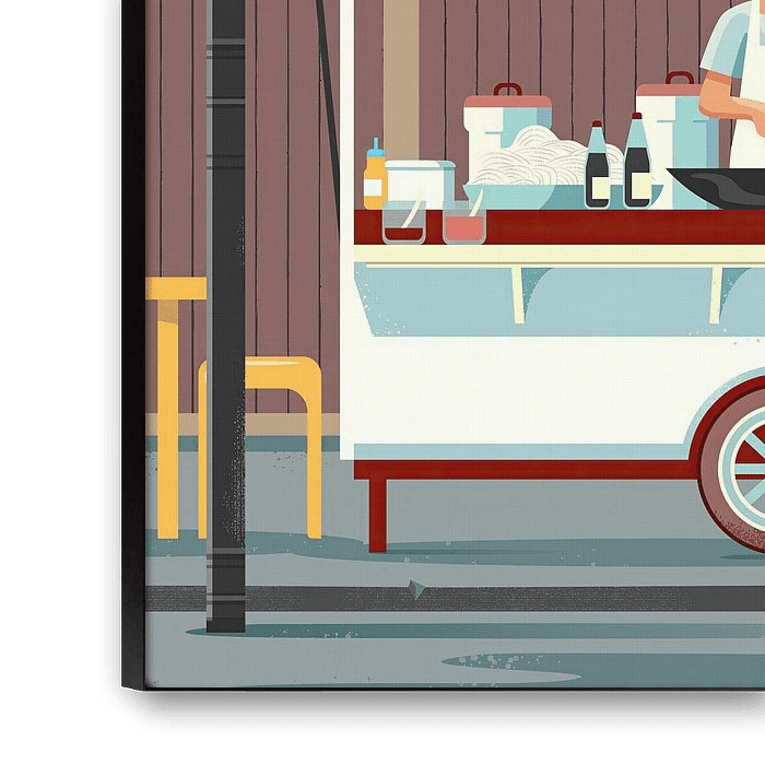 This is my illustration of a street food stall in Indonesia, as you often see them in cities like Jakarta, Bandung and Yogyakarta. Who doesn't love Indonesian dishes like Nasi Goreng, Bami Goreng, Sate Ayam and Gado Gado? Bring a touch of Indonesia into your home with this piece. Perfect for adding an Asian touch to your interior or as a unique gift for foodies and travel lovers.