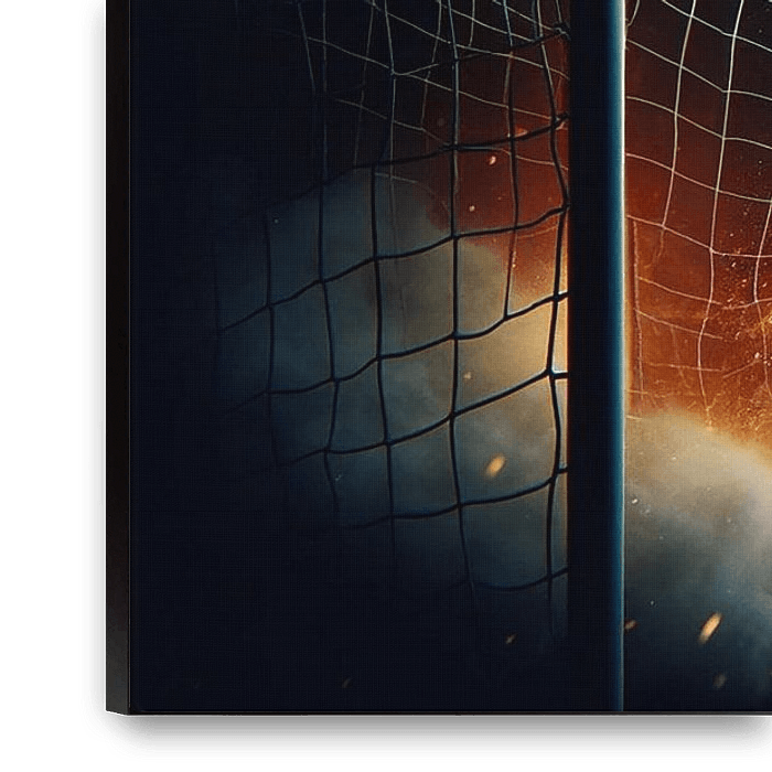 In this dramatic depiction, a football, surrounded by a firestorm, crashes into the football net with immense force. The moment of impact is captured by sparks and embers spraying in all directions, as well as smoke and dust. The darkness of the surroundings emphasises the glowing spectacle and gives the impression that the ball is…