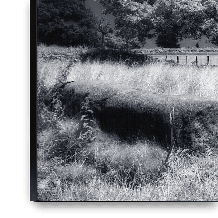 Buy this landscape artwork Infrared mystical landscape B&W with menhirs d' Epoigny Burgundy France by Hidden Light Gallery on canvas, ArtFrame, poster and wallpaper, printed on demand in high quality.