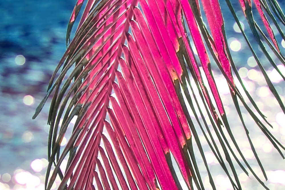 Infrared photo in pink color of palm trees on tropical beach by Michael Piepgras
