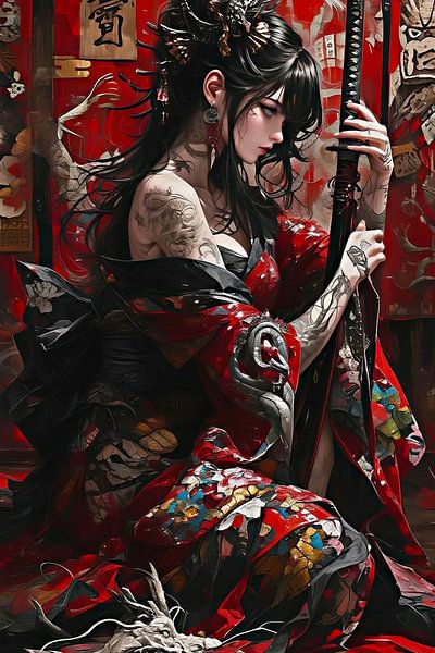 A masterfully detailed warrior adorned in a rich red kimono and intricate tattoos. She sits in quiet contemplation, clutching her katana. The artwork blends traditional elegance with a fierce, modern edge, capturing a moment of deadly grace.