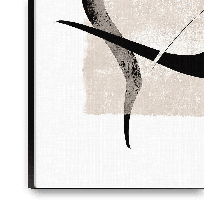 Minimal abstract graphic art. Black line shapes intertwining layered with a beige, neutral, sand colored brush stroke background.