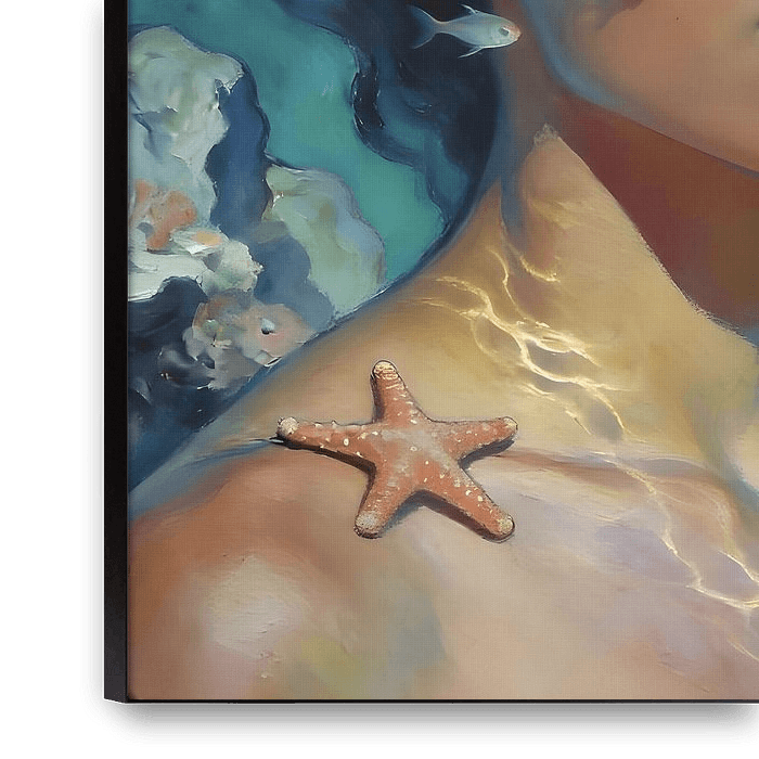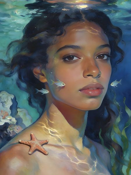 In this work, a young woman looks straight ahead beneath the surface of the water. Sunlight falls brightly on her face and shoulders. Small fish swim close to her skin, while starfish and coral surround her.