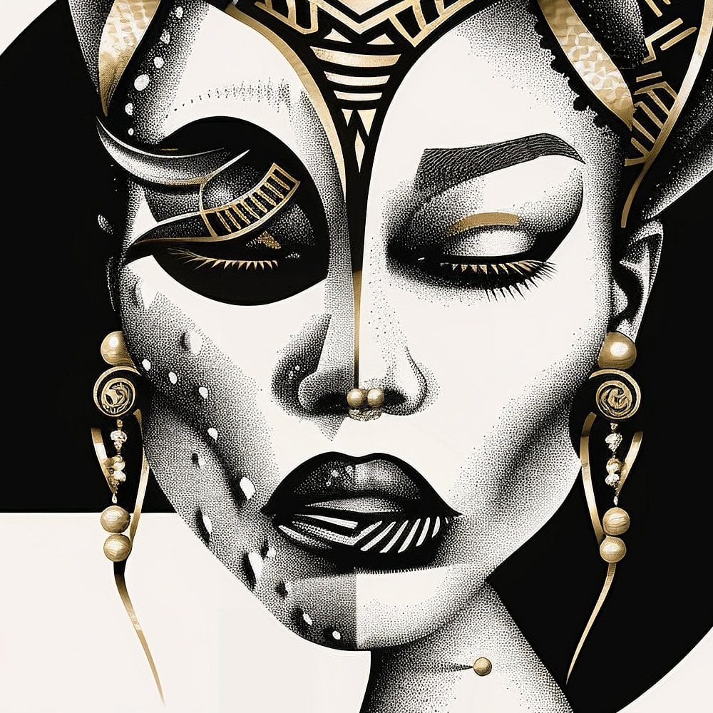 This portrait is a celebration of the distinct and the unique, a fusion of black, white and gold accents that capture the essence of her individuality and mystery.