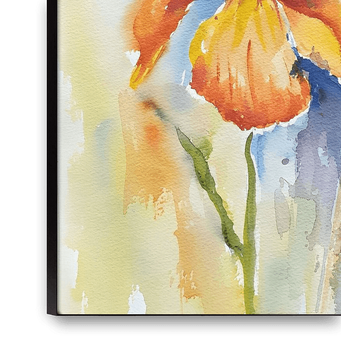 This watercolour captures the beauty and energy of an iris flower in warm, fiery hues of orange, red and yellow. The radiant petals almost seem to glow and form a beautiful contrast to the soft, dreamy background. In it, lilac, blue and subtle shades of green blend effortlessly through the flowing brushstrokes, creating an ethereal and…