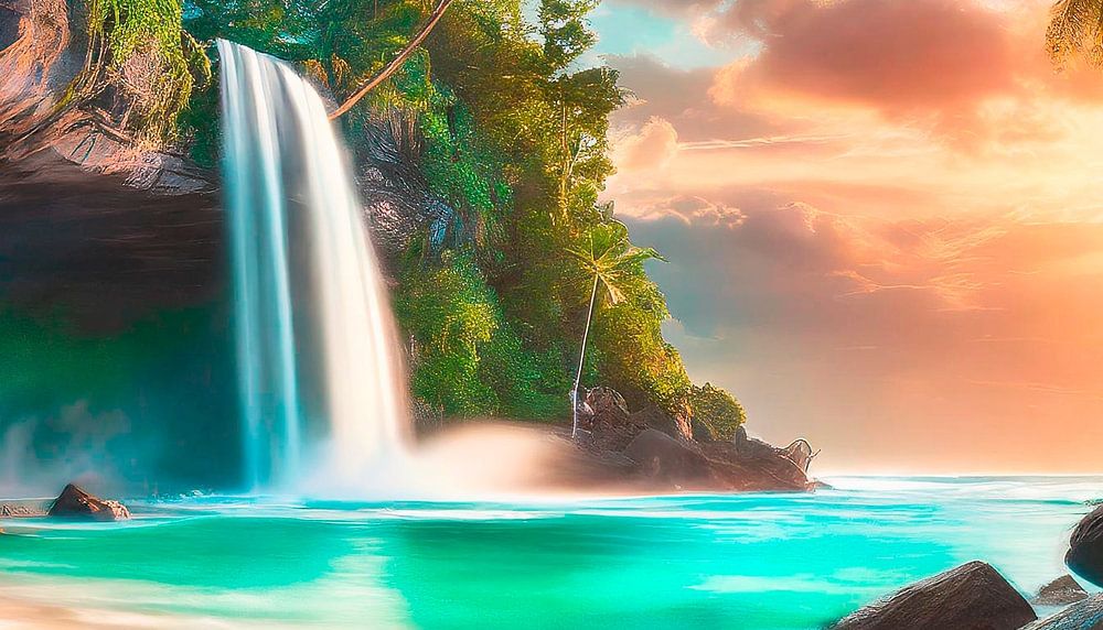 Buy this digital art artwork Island with waterfall and sea by Mustafa Kurnaz as a reproduction on canvas, ArtFrame, poster and wallpaper, printed on demand in high quality.