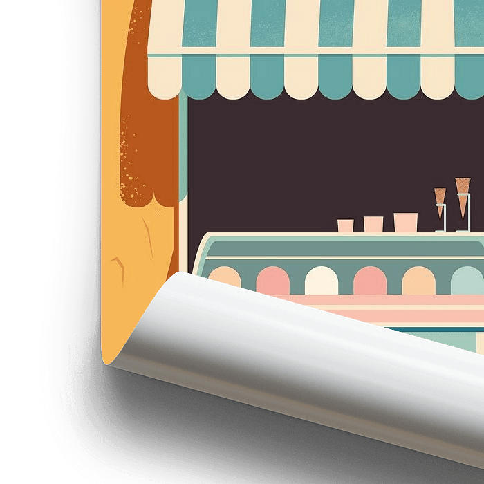 With this illustration of a gelateria façade, I want to depict the charming streets of Italy. The colours of the Mediterranean palette bring warmth and nostalgia. Perfect for adding a touch of Italian flair to your interiors for ice cream lovers and lovers of Italian culture alike.