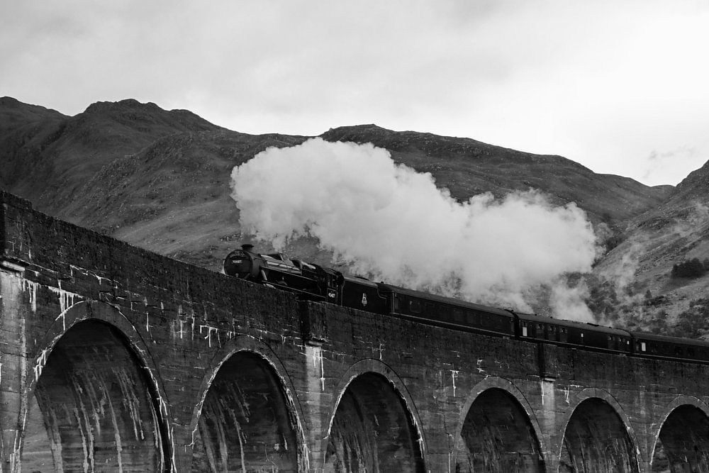 Attention Harry Potter fans: the Jacobite steam train still runs daily in Scotland. This train is also known as the 'Hogwarts express' in the Harry Potter films. This picture was taken as the train passes over the old Glenfinnan viaduct.