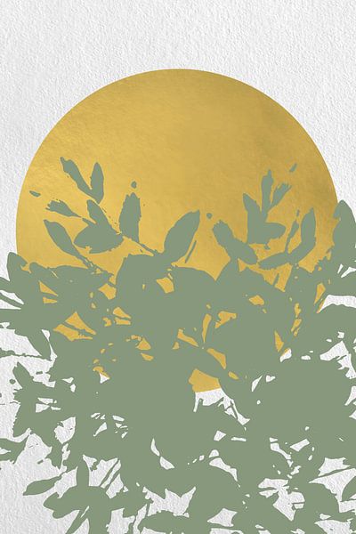 Abstract botanical landscape with golden sun and leaves, twigs, branches in pastel color