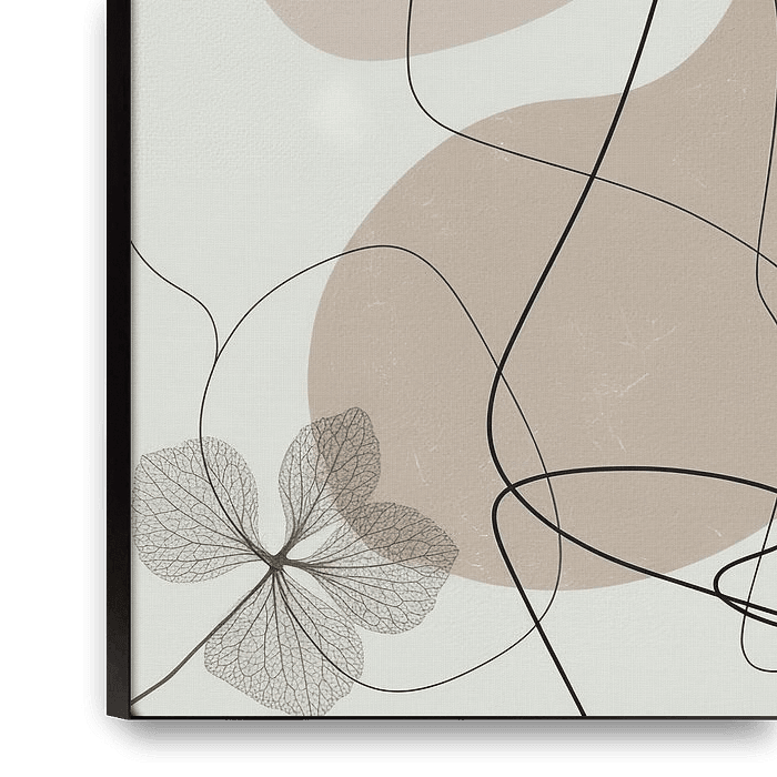 This work is a sophisticated addition to the Wabi-Sabi lifestyle collection. It captures the essence of stillness through the combination of botanical precision and abstract geometry, perfect for those looking for tranquillity and depth in their interiors.