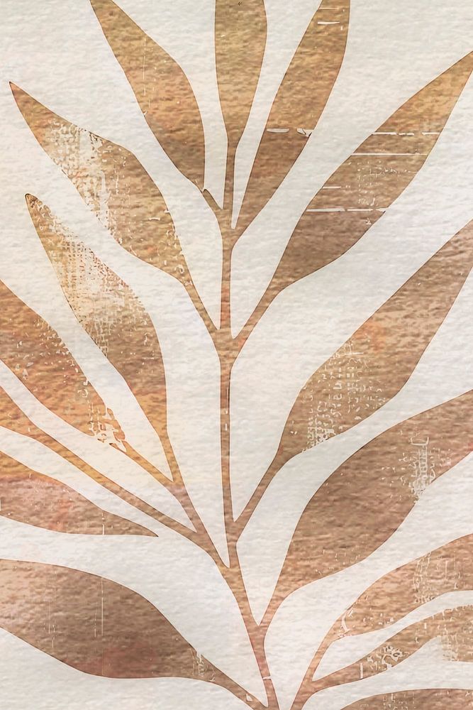 Plants in monochromatic colours and abstract textures merge into a mixed media artwork inspired by Japandi style and Wabi Sabi art