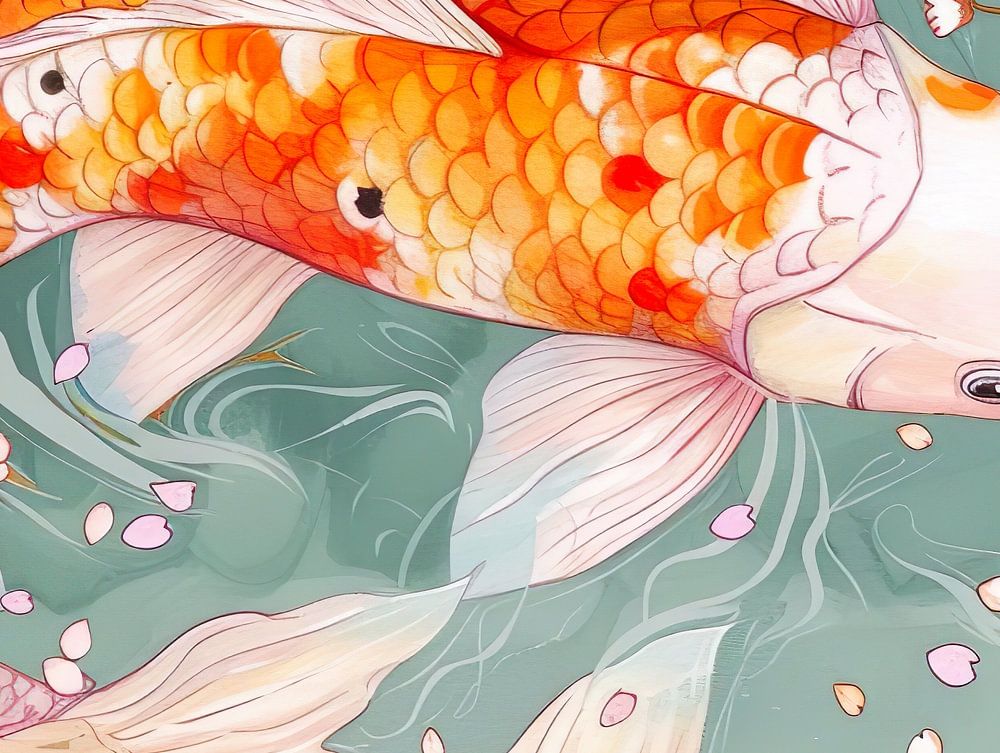 This painting has a charming, sketchy style in which Japanese koi carp and a cherry blossom come together in a harmonious scene. The outlines of the koi carp are gracefully drawn, and their colours - vivid orange, white and deep black - splash off the canvas. They appear to be swimming in an imaginary pond, with elegant movements reflecting the dynamics of water.